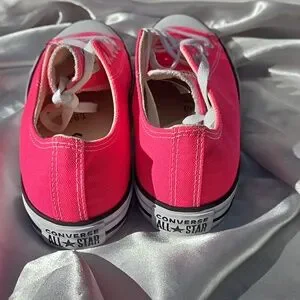 Low-top Converse canvas sneakers in vivid hyper pink. White laces and rubber toe cap. Classic Chuck Taylor tongue label. Simple, bold style for everyday wear. NEW. NEVER WORN