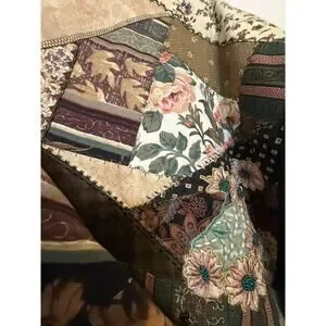 This upcycled handmade patchwork quilt jacket is a unique and artsy addition to any wardrobe. Made from cotton with a colorful multicolor patchwork pattern, this kimono-style jacket features long sleeves and an open closure for a relaxed fit. Features beating around some of the flowers featured in the front and the back. Perfect for travel or casual occasions in the winter, fall, or spring, this XL size jacket is accented with quilted details and a collarless design. With a bohemian, farmhouse, and coastal theme, this one-of-a-kind piece is sure to stand out and keep you stylish and warm.