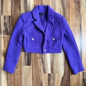Elegant cropped purple tweed jacket. Features button-front closure and flap pockets for a polished look. Soft textured fabric adds dimension and warmth. Versatile purple piece that elevates outfits for day or night. Buttons were originally gold but I spray painted them silver.