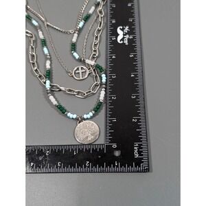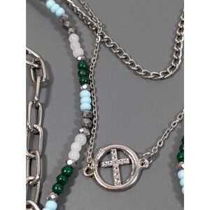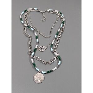 Effortlessly achieve the perfect "stacked" look with this beautiful multi-strand statement necklace. This piece features three pre-layered tiers: a delicate beaded strand in earthy green and teal tones, a classic silver-tone link chain, and a longer strand with a stunning etched medallion and cross-motif charms. It's the ultimate "one-and-done" accessory for festivals, casual weekends, or adding a boho touch to a simple maxi dress.