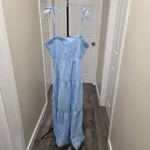 Light Blue Smocked 100% Cotton Midi Dress Tie Strap Swiss Dot Cottagecore Boho
