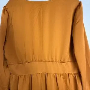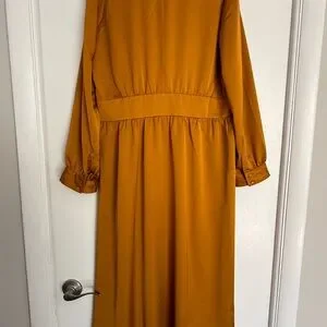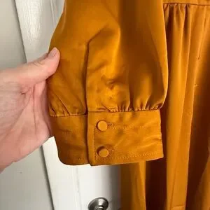 Stylish button-front a-line midi dress with a V-neckline. Defined waist creates a feminine shape. Long sleeves with cuffed detail. Smooth, drapey fabric for easy movement. Warm mustard hue.