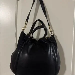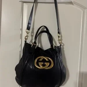 Classic Gucci shoulder bag in smooth black leather. Features a large polished gold GG logo. Includes top handles and a detachable shoulder strap. Gold hardware accents throughout.