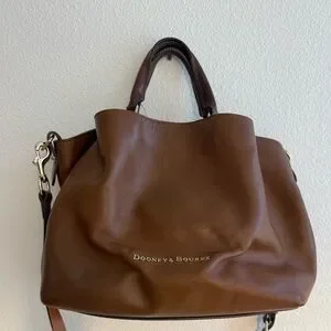 Dooney & Bourke brown leather satchel with top handles and detachable adjustable crossbody strap. Soft, slouchy silhouette in rich smooth/pebble leather with gold ‘Dooney & Bourke’ logo on the front. Open top with magnetic/zip (see photos) and spacious interior with slip and zip pockets to keep essentials organized. Classic everyday bag that can be carried by hand, on the shoulder, or crossbody. Gently used with light creasing from normal wear; no major stains or damage (see photos for condition). Approx. measurements: