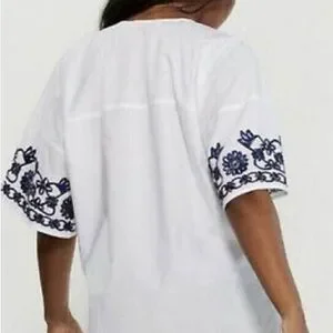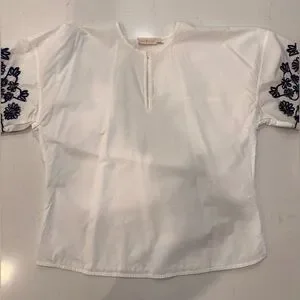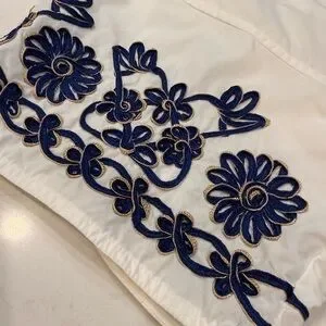 •White blouse with beautiful blue and gold embroidery detailing on the sleeves