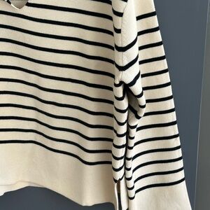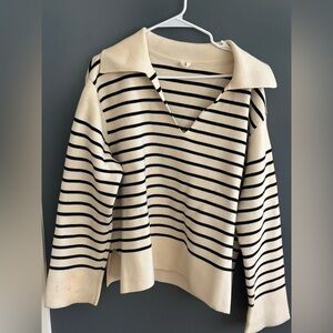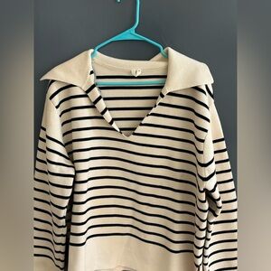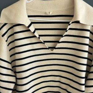 Collared black and cream striped sweater.