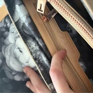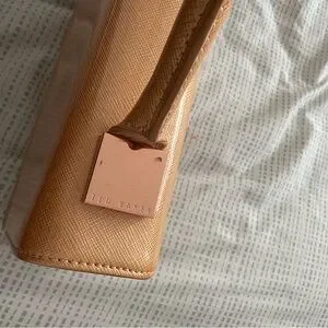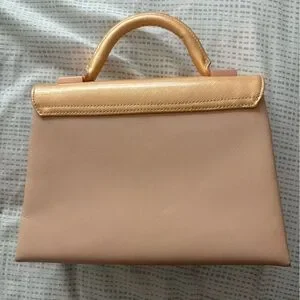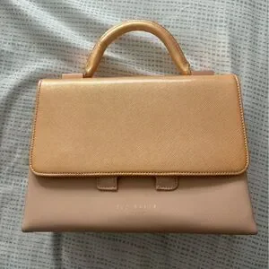 Elegant Ted Baker satchel in metallic gold and soft blush tones. Structured silhouette with a single top handle. Subtle logo detail on the front. Sleek and versatile for day-to-night wear. Condition is amazing with minimal signs of wear!