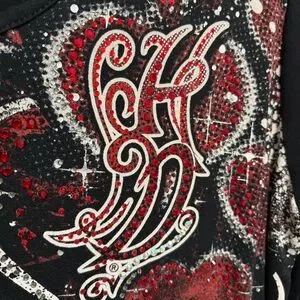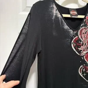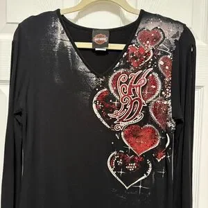 Black V-neck long-sleeve top by Harley-Davidson. Red heart graphics cascade along the shoulder. Rhinestone and printed accents add sparkle. Slim, flattering cut for layered looks.