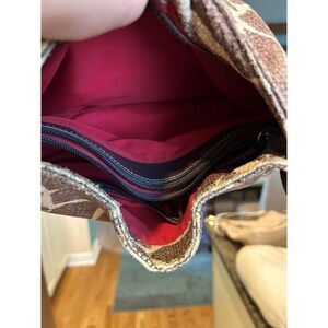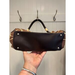 Sandra Roberts giraffe print woven handbag. So pretty and unique. The bag is in good condition with just some wear along the top of the bag. The interior, bottom and corners look good. Measures approx 13" x 9" x 4"