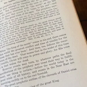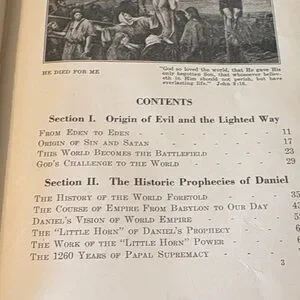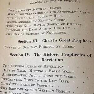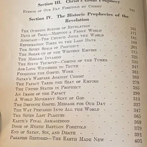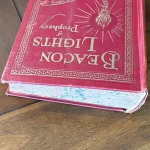 Classic red decorative hardcover book titled "Beacon Lights of Prophecy." Features gold-embossed cover details and a rich red finish. Adds a timeless accent to shelves, mantels, or coffee tables. The red color complements traditional and vintage decor styles.