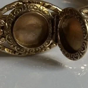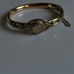Polished Goldfilled Goldplated bangle clasp bracelet with security chain and locket space on the top with ornate filigree accents. Size 7 . Hinged design for easy wear. Includes safety chain for added security. Classic vintage-inspired style for dress or daily wear. Signed. The condition and shape are preowned excellent!