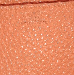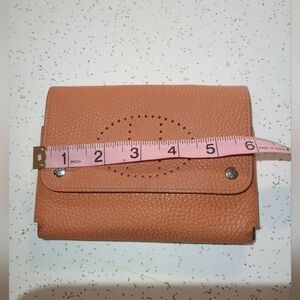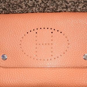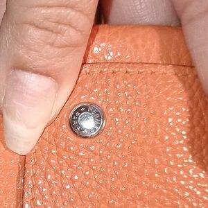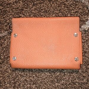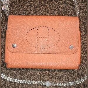 Stylish orange leather crossbody wallet with perforated 'H' emblem. Compact design with secure flap closure and silver-tone studs. Perfect for hands-free wear and everyday elegance. Orange color adds a vibrant, polished touch.