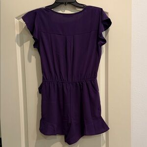 Rich purple romper with a wrap-style front. Short flutter sleeves. Tie at the waist for a flattering fit. Flowing ruffle hem for movement.