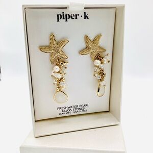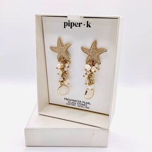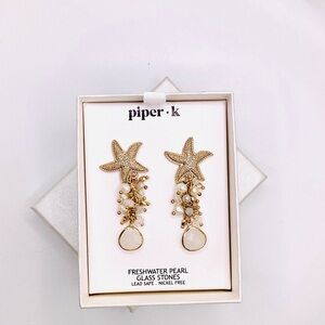 Elegant piper•k gold starfish earrings with cascading freshwater pearls and glass stones. Lightweight drop design featuring gold tones and soft white pearls for a refined look. Perfect for adding a polished, beach-inspired touch to any outfit.