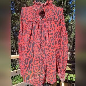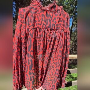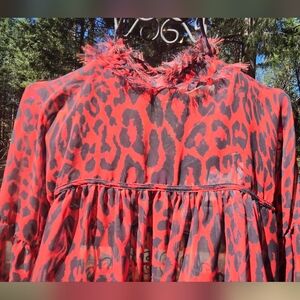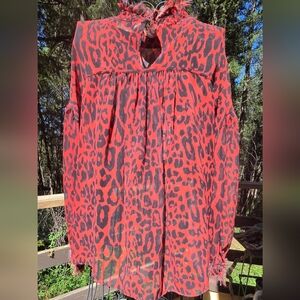 Zara 1975 Jeans Collection Red&Black Leopard Print Sheer Long Sleeve Blouse SzM