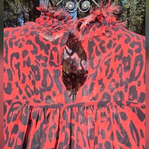 This is a beautiful lightweight, flowy sheer fabric with bold leopard print blouse by Zara, from theor 1975 Jeans collection. It has long sleeves with gathered yoke details, sheer finish with relaxed silhouette. Striking red and black colorway for statement looks. This is a NEW piece with tags, that I purchased here on Poshmark and never wore. The approximate unstretched measurements;