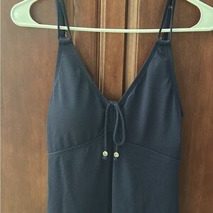 Tommy Bahama Island Cay navy spa dress. V-neckline with a center tie and bead accents. Thin double spaghetti straps. Streamlined, versatile silhouette.