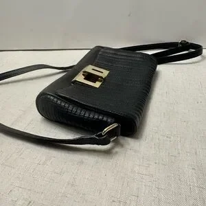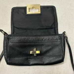 Calvin Klein shoulder bag with textured quilted exterior. Front gold-tone rectangular turn-lock clasp. Adjustable strap for shoulder or crossbody wear. Classic silhouette for everyday style.