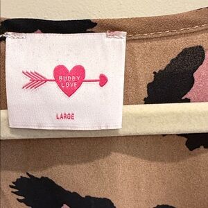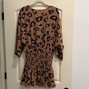 Cute Buddy Love dress in tan with pink and black leopard spots. Smocked waist for a playful silhouette. V-neck and long sleeves. Soft, flowy fabric ideal for everyday wear.