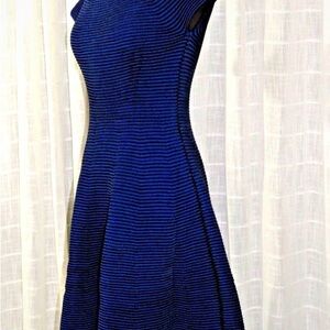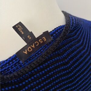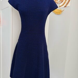 Elegant Escada midi dress in a deep navy knit. Textured ribbed fabric with a flattering fit-and-flare silhouette. Short cap sleeves and a modest neckline. Versatile for day or evening wear.