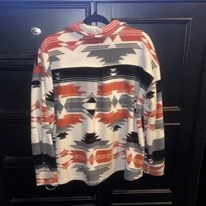 Stylish women's jacket featuring a vibrant pattern. The jacket combines orange, black, and white for a bold look. Perfect for adding a pop of color to your wardrobe. (Shirt sold separately)
