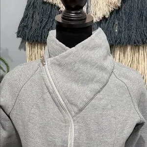 Diagonal zip up sweatshirt in a heavyweight gray material perfect for those chilly spring morning walks or breezy sunsets on the beach or lake! This is a beautifully made sweatshirt to fit all occasions!