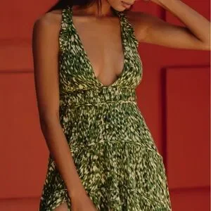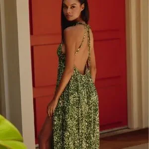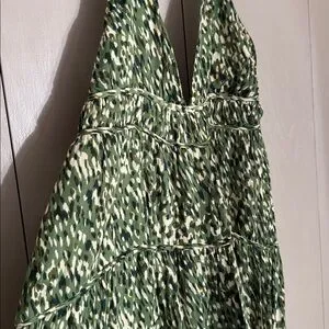 Elegant green printed halter maxi dress with a deep V neckline and a front leg slit. Flattering fitted waist and flowing skirt for easy movement. Perfect for daytime events or evening outings. Soft, breathable fabric for comfortable all-day wear.