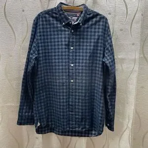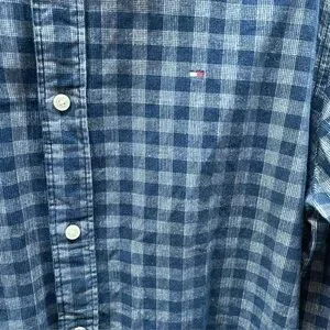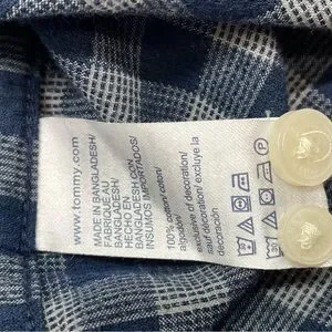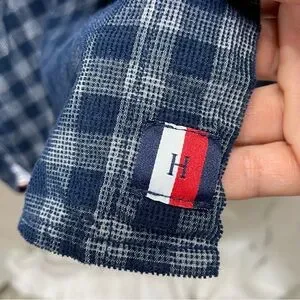 Elevate your everyday wardrobe with this sophisticated Tommy Hilfiger button-down shirt, featuring a classic navy and light blue gingham check pattern. Crafted from breathable 100% cotton with a subtle textured weave, this regular-fit shirt offers both comfort and a polished aesthetic. Distinctive details include a button-down collar, contrast striped interior trim at the neck and side gussets, and the iconic flag logo embroidered on the chest. This garment is in excellent pre-owned condition, maintaining its crisp structure and vibrant color. Perfect for casual Fridays at the office, weekend brunch, or a relaxed dinner date.