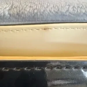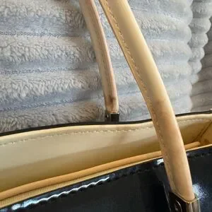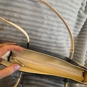 Sleek patent exterior in black with cream accents. Dual shoulder straps for easy carry. Decorative gold-tone charm adds a touch of sparkle. Structured silhouette for polished looks. I bought 4 of these from a vintage/Y2k seller. This purse had never been used and is believed to be a 2005. There is some discoloration (as shown in pics) probably due to age but she is a solid classic!! I added a little purse charm for the taking of this stylish little number!!