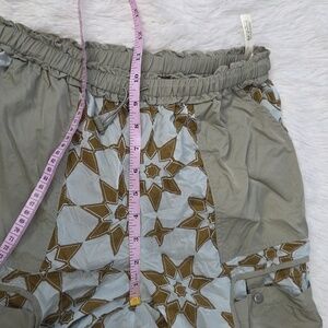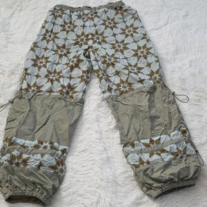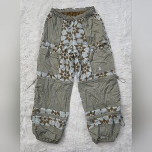 Features: Low-rise style; drawstring waist, knees, and bottom hem; exaggerated pockets; nylon fabric; 6-pocket style