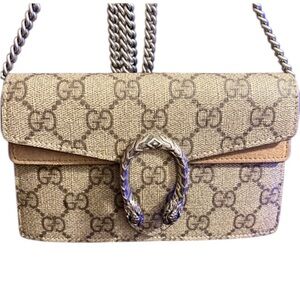 Keywords: Gucci, Dionysus, Super Mini, GG Supreme, Monogram, Canvas, Taupe, Suede, Tiger Head, Crossbody, Shoulder Bag, Designer, Luxury, Authentic, Italy, Italian Leather, Petite, Small Bag, Date Night, Cocktail, Formal, Casual, Capsule Wardrobe, Investment Piece, Classic, Horsebit, Silver Hardware.
