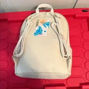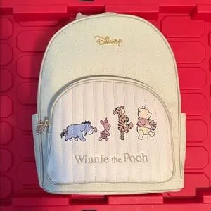 Cute Disney backpack with Winnie the Pooh characters on front pocket. Embossed Pooh faces and gold-tone Disney logo. Zippered front pocket and main compartment. Soft cream color with subtle pink accents on characters.