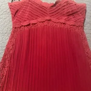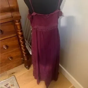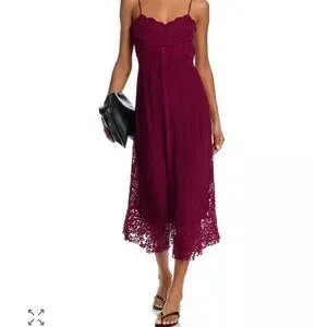 Elegant deep red midi dress( Farm Rio) with delicate spaghetti straps and lace-trim hem. Soft, flowing fabric drapes for a flattering silhouette. Perfect for evening events or special occasions. Lightweight and breathable for comfortable wear. Worn 2 times. Paid over $200.