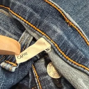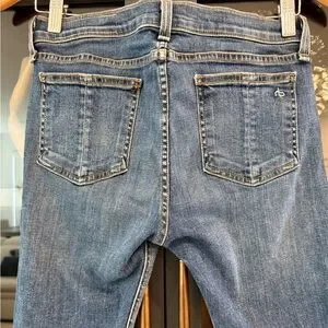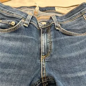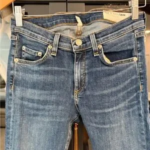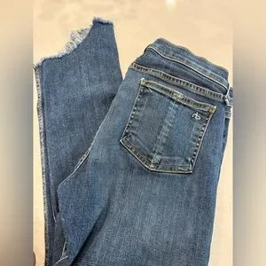 rag & bone cropped jeans in blue denim. Raw frayed hem detail. Straight leg with slight taper. Classic five-pocket styling. Easy, casual staple for everyday wear. Worn once.