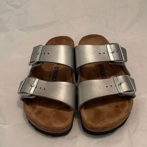 Classic two-strap Birkenstock sandals. Metallic silver upper with adjustable buckles. Contoured cork footbed for support. Easy slip-on style for everyday wear.