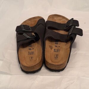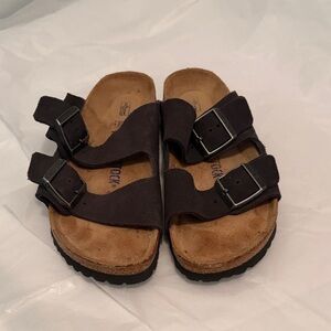 Iconic two-strap Birkenstock sandals. Dark brown suede uppers with adjustable metal buckles. Contoured cork footbed for support. Casual everyday style.