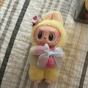 Adorable plush doll wearing a yellow fuzzy bunny suit. Pink face with big eyes and a crown. Pastel iridescent bow wraps the body. Soft and collectible style.