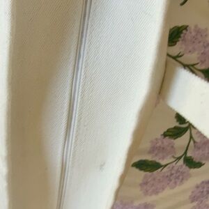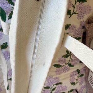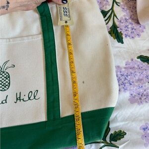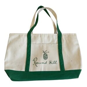 Incredibly sturdy canvas tote with zipper top and contrast green trim. Features comfortable handles and an exterior pocket. Pineapple logo and script branding on front. Neutral cream body with deep green accents.