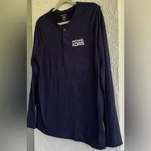 Navy blue long sleeve top with buttoned neckline. Features Michael Kors logo on chest.