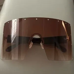 Futuristic oversized shield sunglasses. Brown gradient lens with small stud accents across the top.