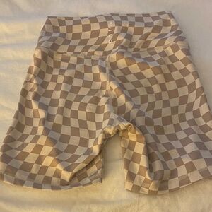 Comfortable high-waist athletic bike shorts with a beige and white checkerboard pattern. Smooth, stretchy fabric for breathability and freedom of movement. Wide waistband for support and a flattering fit. Designed for workouts, yoga, and everyday activewear.