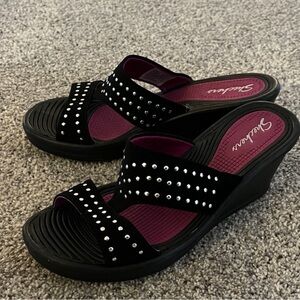 Skechers Black Wedge Sandals with Magenta Insole and Silver Studs