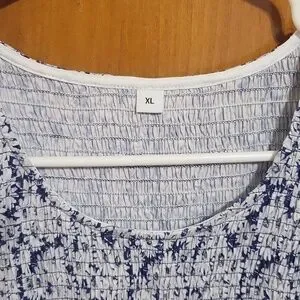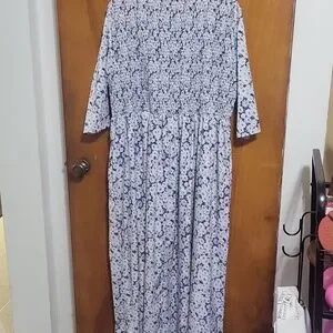 Lightweight midi dress with smocked bodice. Blue floral print on a white background. Three-quarter sleeves. Unbranded, size xl