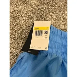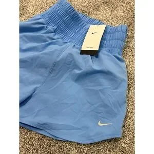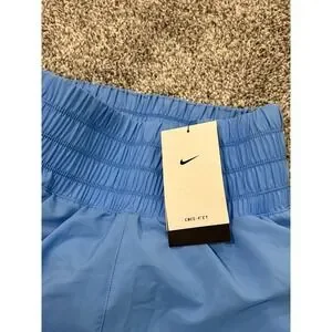 Nike women's athletic shorts in light blue. Elastic smocked waistband for a secure fit. Lightweight, breathable fabric for running and training. Side pockets and curved hem for mobility. Small reflective Nike Swoosh logo.