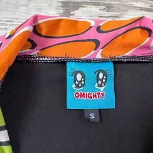 Vibrant OMIGHTY mini dress featuring a bold psychedelic swirl print in pink, orange, and green. Collared polo-style neckline with a fitted silhouette. Stretchy fabric with eye-catching allover graphic.