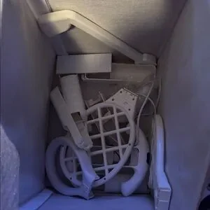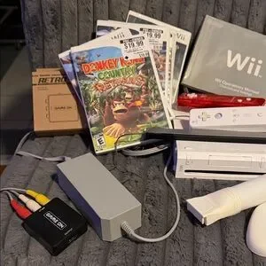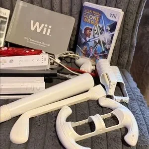 Nintendo Wii console with white remotes, nunchuks, and accessories. Includes sensor bar, charging cables, and gun-style attachments. Assorted Wii game discs and cases included. Comes with original Wii manual and extras. Ready for setup and play.