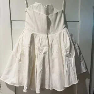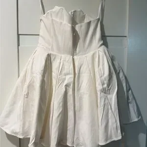 Strapless sweetheart neckline. Fitted bodice with pleated full skirt. Structured silhouette for a flirty look. Clean white finish. Perfect for parties or events.