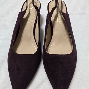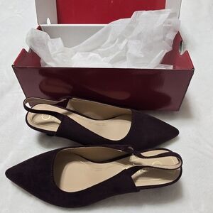 Oxblood suede slingback flats with a pointed toe. Cushioned insole for everyday wear. Clean, minimalist silhouette that pairs with dresses or trousers.