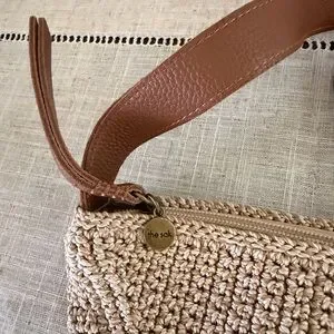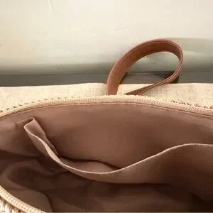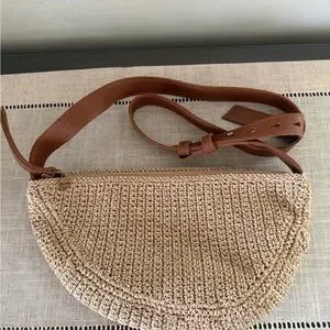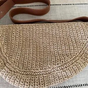 Stylish half-moon woven crossbody in beige with a brown adjustable leather strap. Lightweight and easy to carry for everyday outings. Neutral beige weave pairs beautifully with warm brown trim for a polished look. 12X7 Like new. Used a couple of times.