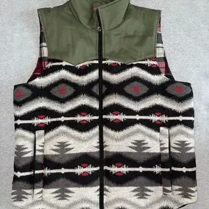 Sleeveless zip-front vest with bold southwestern knit pattern. Olive canvas yoke and stand collar. Neutral black, gray, cream and small red accent details.